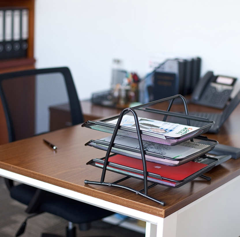 Ngoài ra, hãy tận dụng không gian theo chiều dọc bằng các khay tài liệu nhiều tầng để tiết kiệm diện tích mặt bàn. Các sản phẩm khay hồ sơ của Batos giúp việc sắp xếp tài liệu trở nên gọn gàng và khoa học hơn.