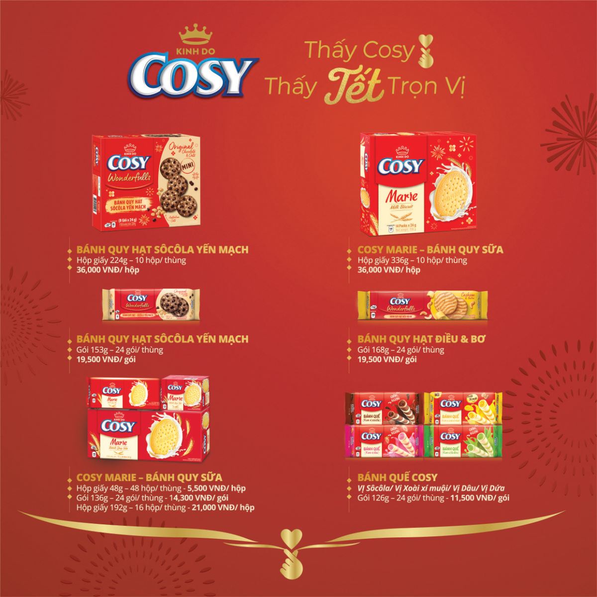 Một lợi thế lớn của bánh quy Cosy là chính sách khuyến mãi linh hoạt trong mùa Tết, thường đi kèm quà tặng hoặc combo tiết kiệm, giúp kích cầu mua sắm hiệu quả và tăng giá trị trên mỗi đơn hàng. Nhờ mức giá hợp lý và thương hiệu quen thuộc, bánh quy Cosy luôn nằm trong nhóm sản phẩm bán chạy dịp Tết.