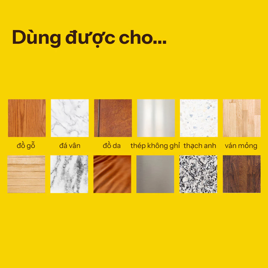 Bên cạnh đó, sản phẩm có thể sử dụng linh hoạt trên nhiều loại bề mặt khác nhau như gỗ tự nhiên, gỗ công nghiệp, da, sơn mài, đá và một số bề mặt nội thất phổ biến khác.