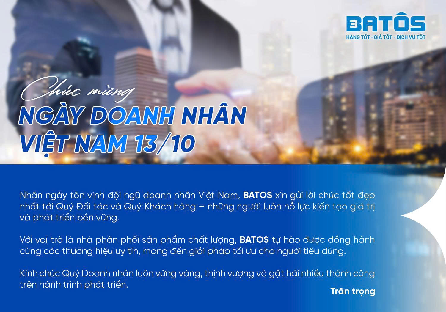 Nhân ngày Doanh nhân Việt Nam 13/10, Công ty CP Chuyên Bán Buôn Batos xin gửi lời chúc mừng trân trọng tới Quý Doanh nhân, Đối tác và Khách hàng những người luôn tận tâm, kiên định và đầy nhiệt huyết trong hành trình phát triển kinh doanh và đóng góp cho xã hội.