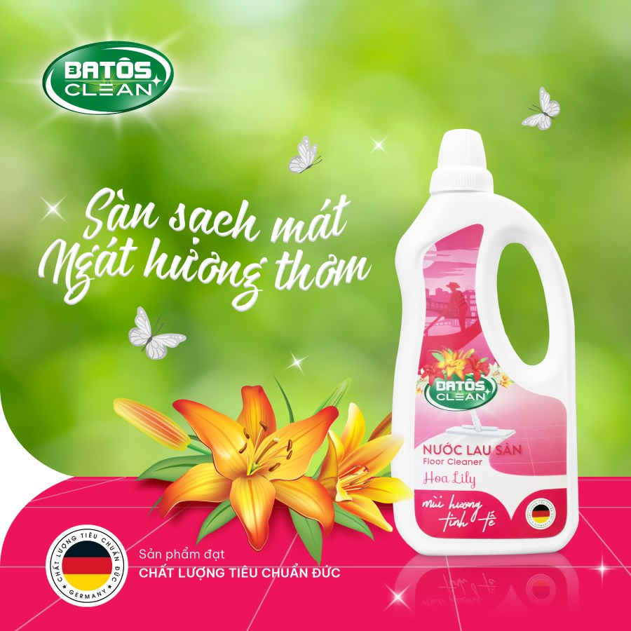 Với nước lau sàn Batos Clean, sàn nhà không chỉ cần sạch mà còn phải thơm. Dòng nước lau sàn được thiết kế với ba mùi hương hoa sang trọng, phù hợp với nhiều phong cách không gian khác nhau.