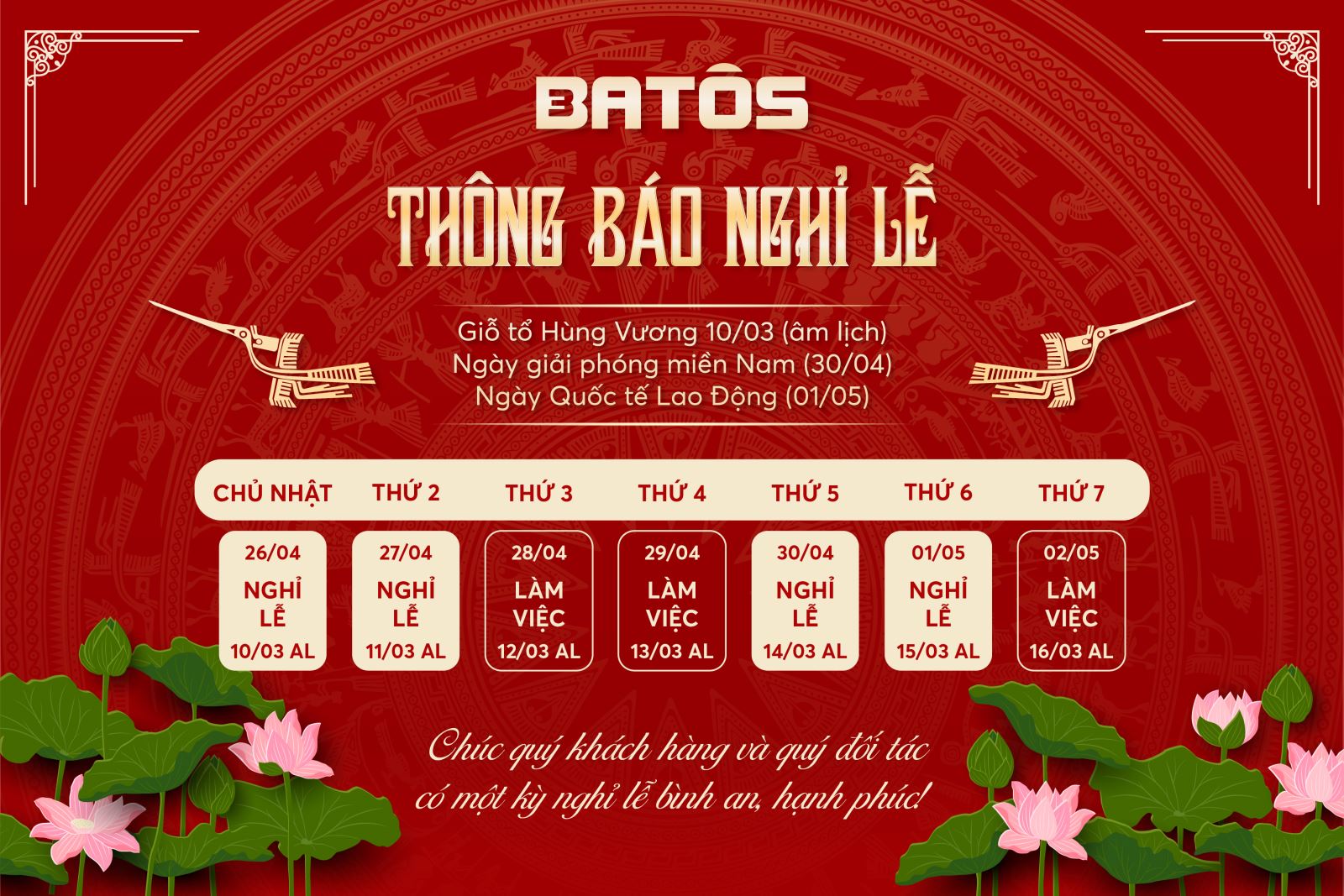 Để Quý vị chủ động trong việc sắp xếp công việc và kế hoạch đặt hàng, Batos xin trân trọng thông báo lịch nghỉ lễ Giỗ Tổ Hùng Vương (10/03 Âm lịch), Ngày Giải phóng miền Nam (30/04) và Ngày Quốc tế Lao động (01/05) năm 2026 như sau: