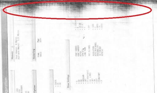 Khi bản in xuất hiện vệt đen, vệt trắng chạy dọc từ trên xuống hoặc mực bị lem ra ngoài vùng in, rất có thể gạt mực của máy đã bị hư hỏng.